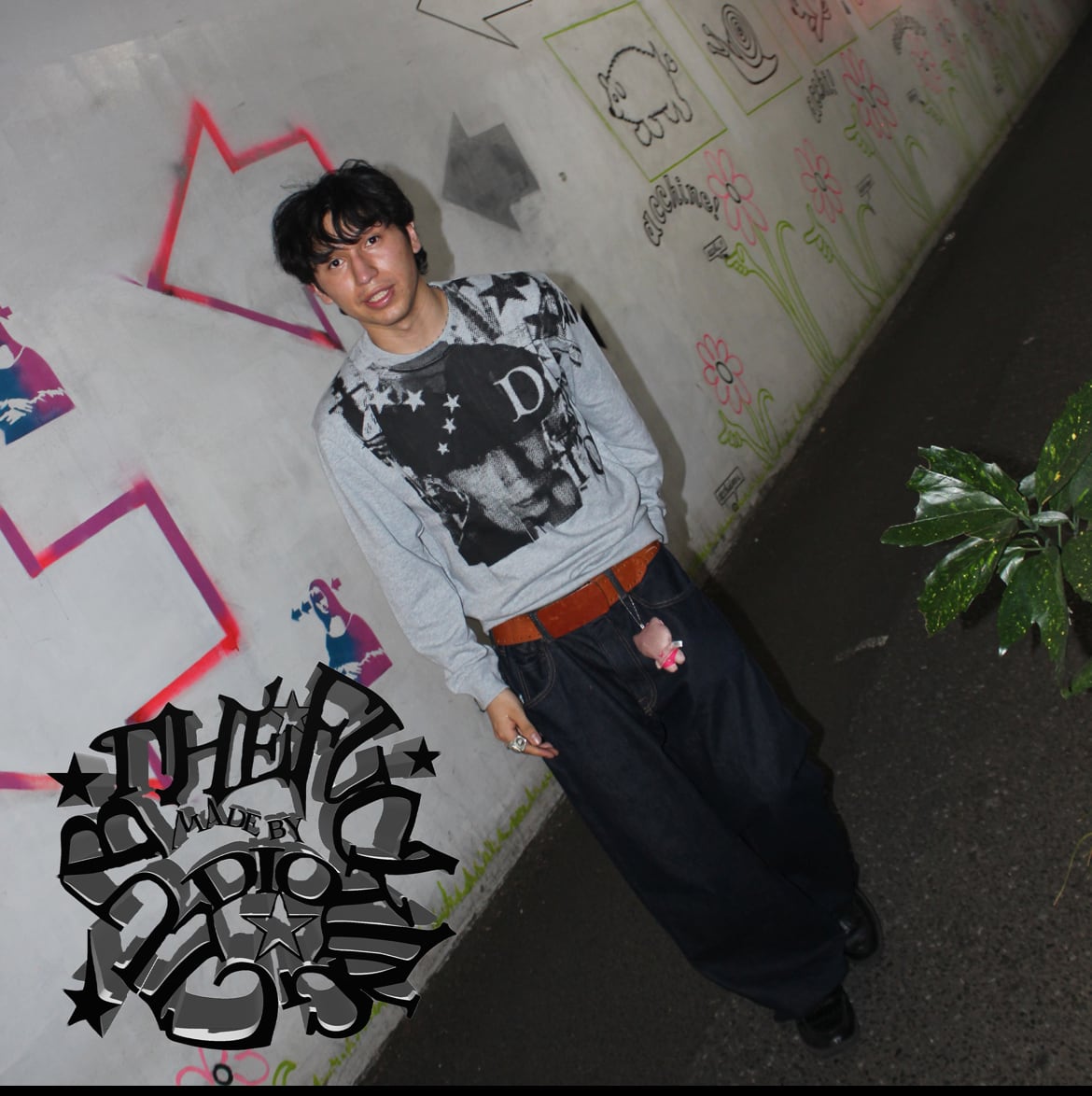 ドット柄で顔を大きくプリント。背景はわかりずらいですが一応New Yorkです。顔だけでなくブランド名からDIOを抜粋、星もプリントデザインに落とし込みました。個人的な隠れたお気に入りポイントが左袖の一部までプリントされているところです。なんかプリント位置変じゃね?と思う方もいたと思いますが、やっぱりプリントデザインも位置も想定内で収まるのつまらないじゃん、一味捻ってみようぜってことでこのデザイン、位置となっています。隠れたお気に入り所。
