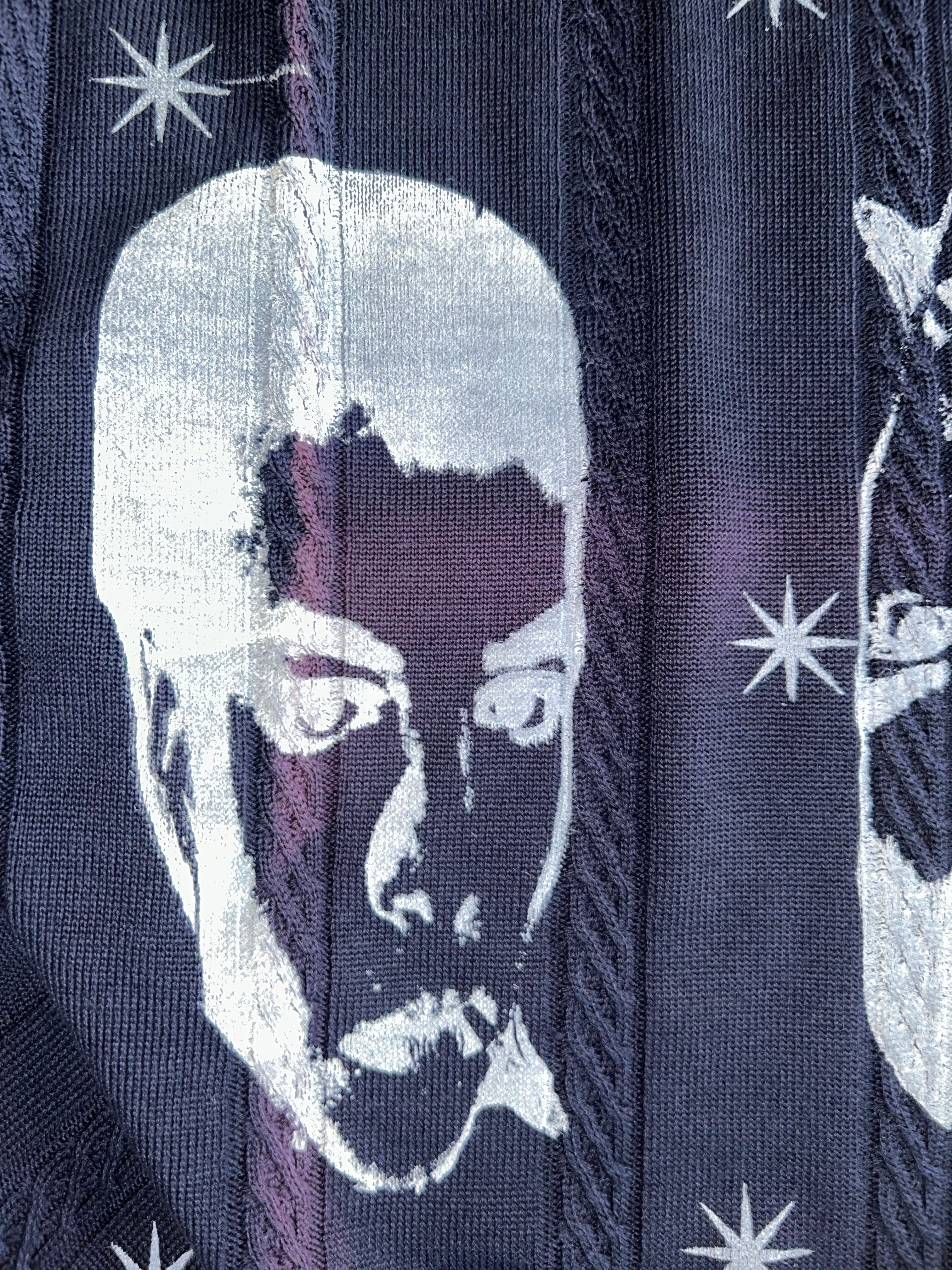 ネイビー色のニットに星と顔をプリント