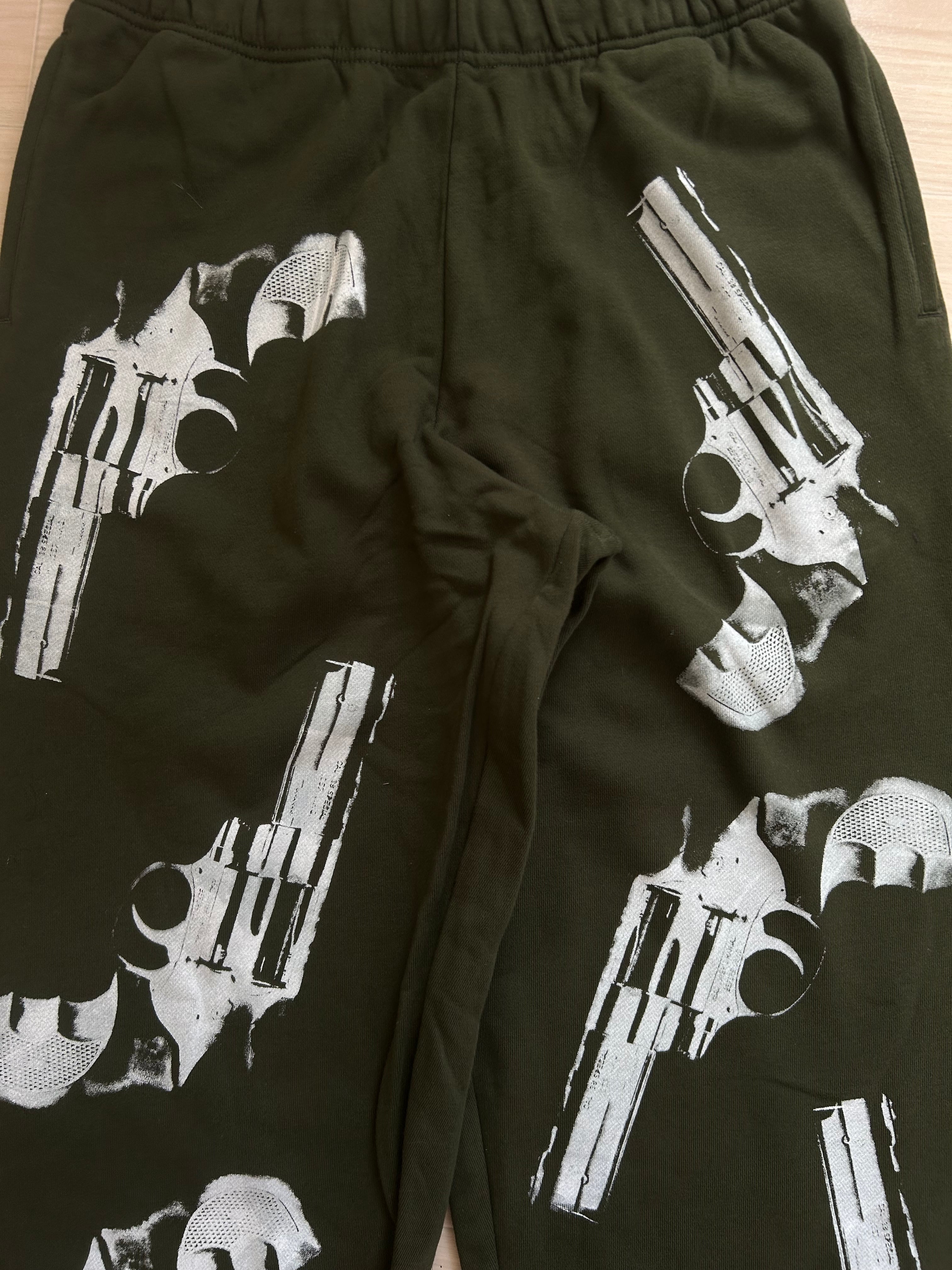 ダークグリーン色のスウェットパンツ両面計12つの銃をプリントした一本。