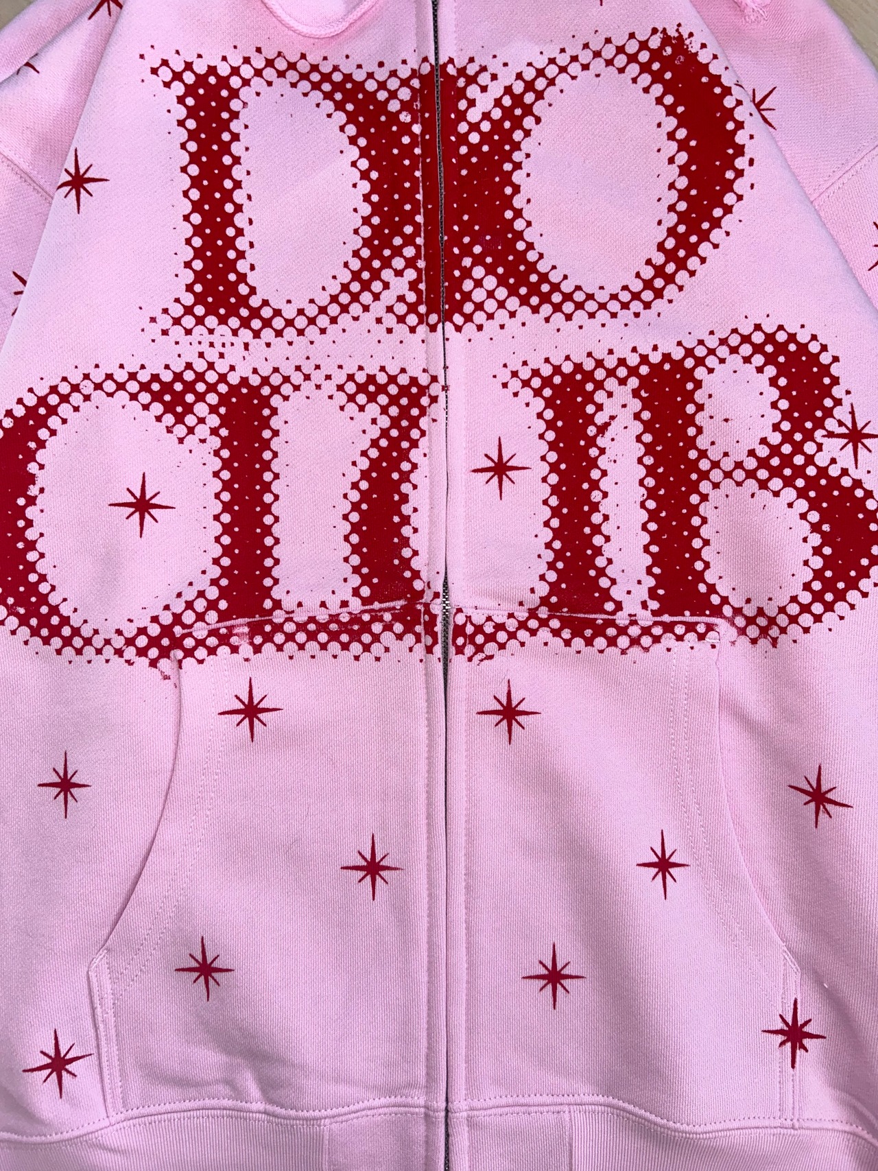 ピンクボディに赤インクでプリントを施しています。