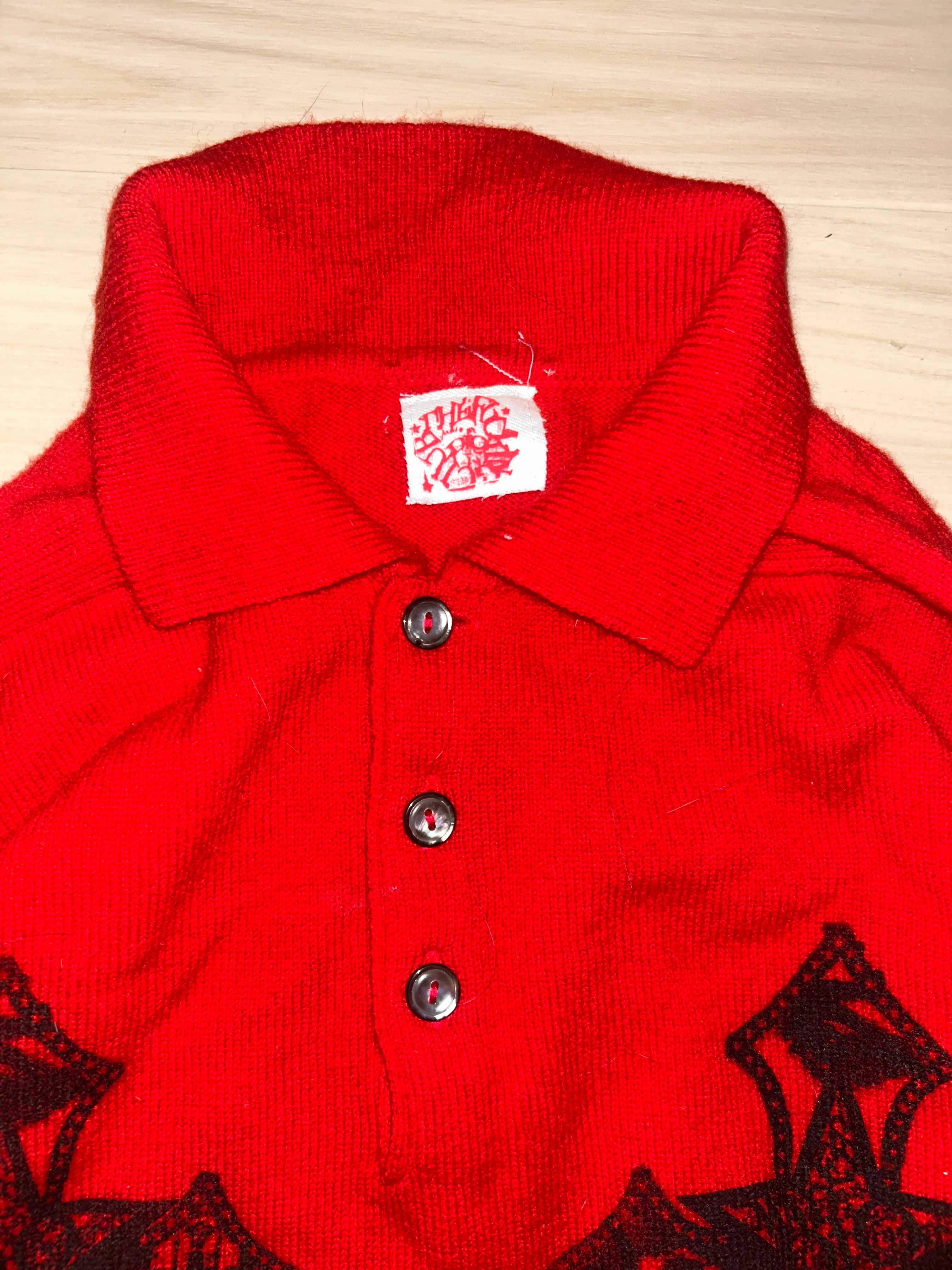 綺麗な赤のポロニットにプリントした一点もの。一枚でもインナーで差し色にも良き