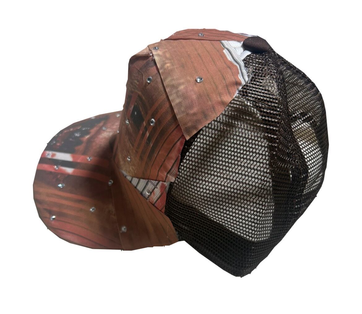 メッシュキャップに顔がプリントされた布をくっつけた一品。ストーンもつけました。